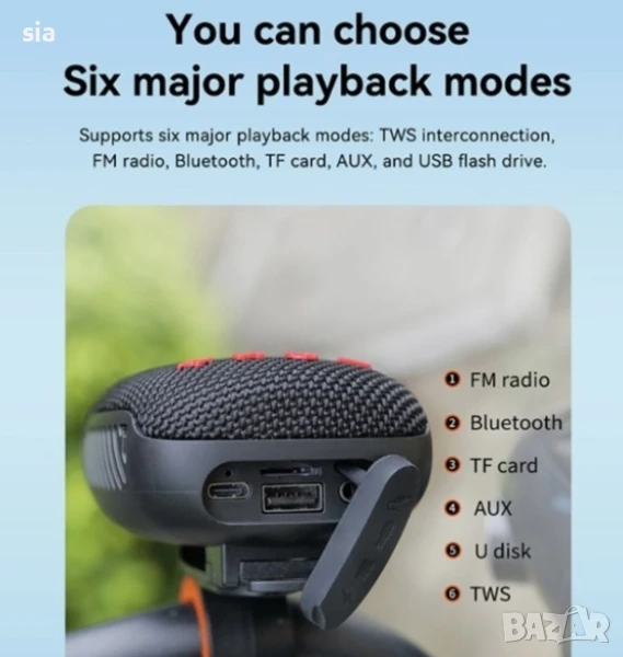 Поддържа 6 източника на слушане на музика - FM радио, блутут, TF карта памет, AUX, флаш памет, TWS връзка.