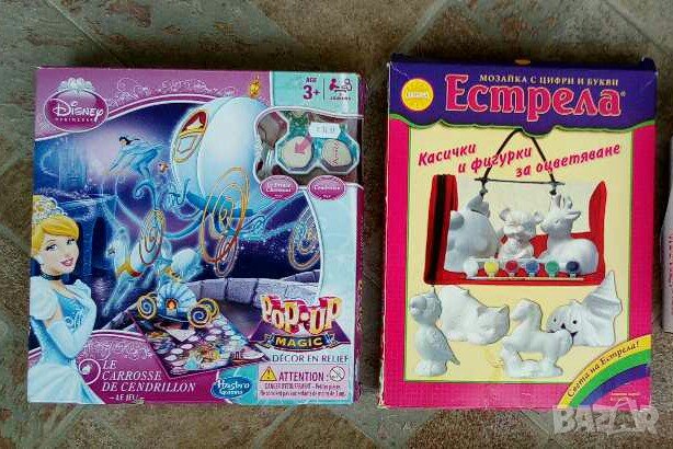 Забавна игра Пепеляшка. Играта включва 2 фигурки на Пепеляшка и Принца, три измерен декор при което отваряне се образува три- измерна - Карета на Пепеляшка - игрално поле, жетони, часовник рулетка и упътване. Предлага се с оригиналната си кутия с оригиналната си цена, няма липсващи части, като нова. Забавна и интересна, най-вече за момиченца. Цена 20 лв.