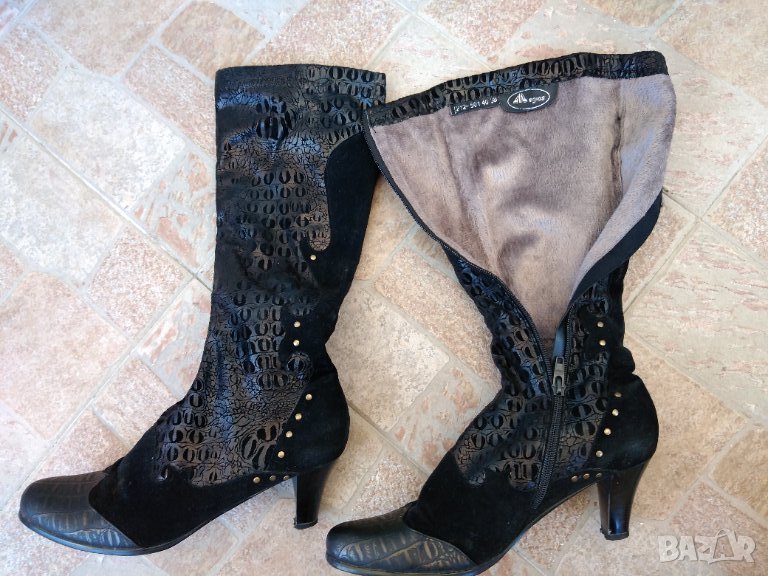 Черни дълги ботуши от плат имитация на кожа и велур с висок ток, номер 38. Обувани са само два пъти, от вътрешната страна има подплата. Височина на тока 6 см.