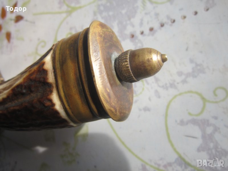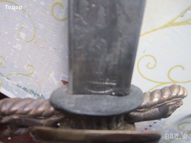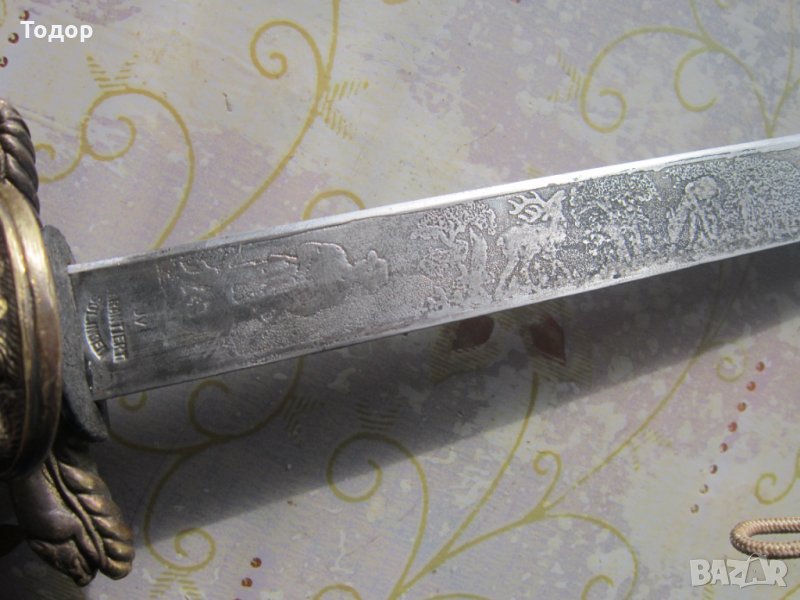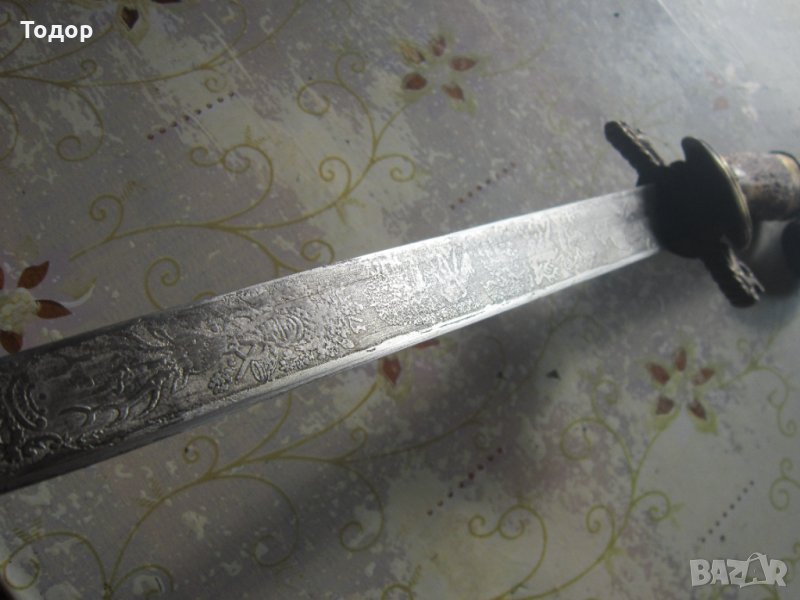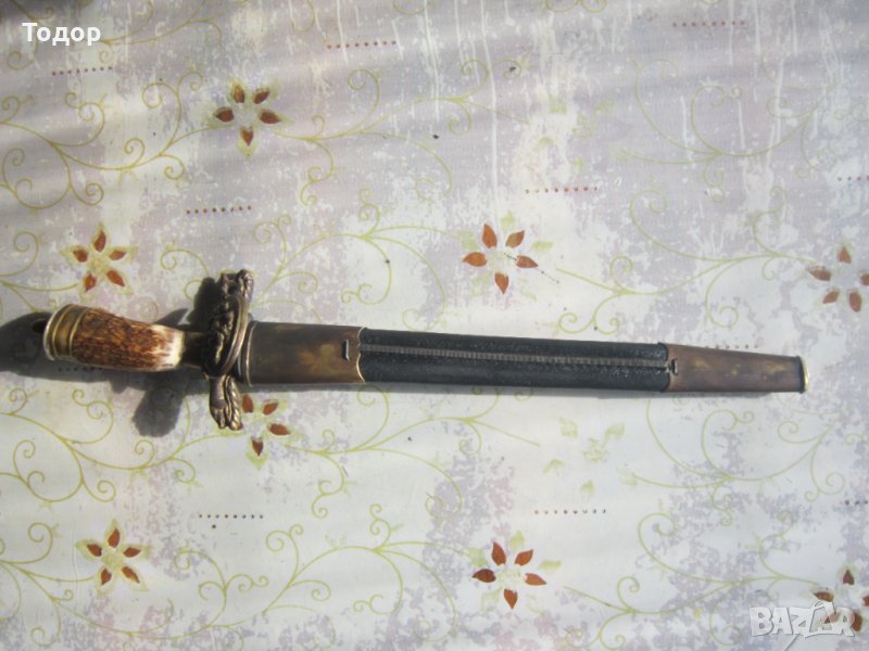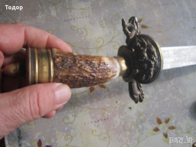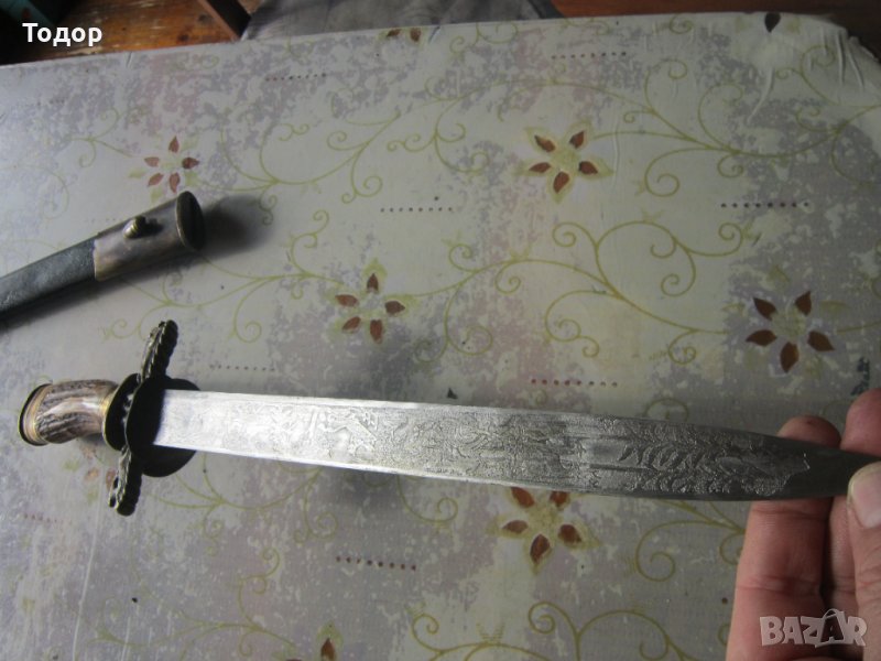 Невероятна стара изработка Дължина 46 см на острие 32 см с кания 47 см ширина на острие 28 мм дебелина на стом 5 мм Многобройни и ясни маркировки на острието От двете страни острието е покрито ловни сцени Прекрасен бронзов гард Страхотна дръжка от еленов рог Оригинална дебела кожена кания с бронзови накрайници За топ колекция