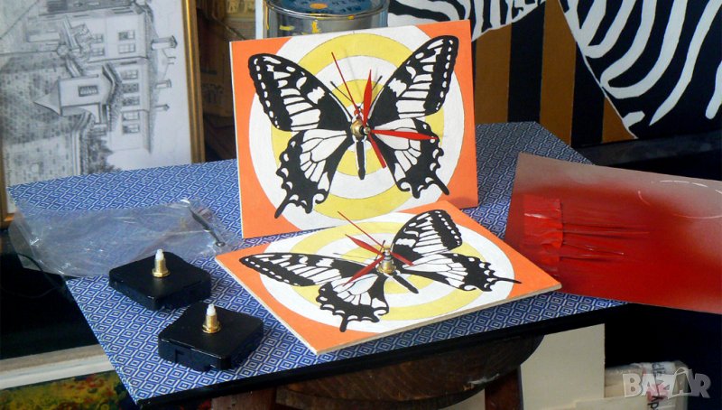 Изработвам стенни часовници по поръчка. Правя ги от дърво, отгоре рисувам с четка и боя. Размерите им са 20 на 15 см. Може да се правят и в други цветови комбинации. Примерно фона около пеперудата може да е в бял и син цвят, бял и зелен и др. Отзад ги подписвам, пиша Мартин Гергински и година на създаване. За повече информация и поръчка-пишете ми на лично.