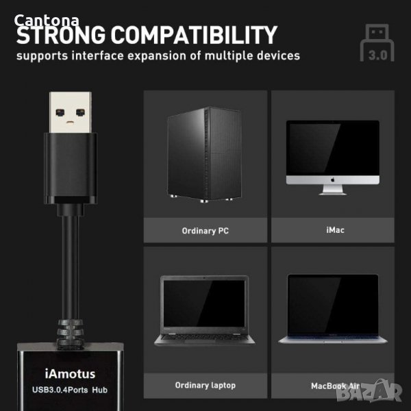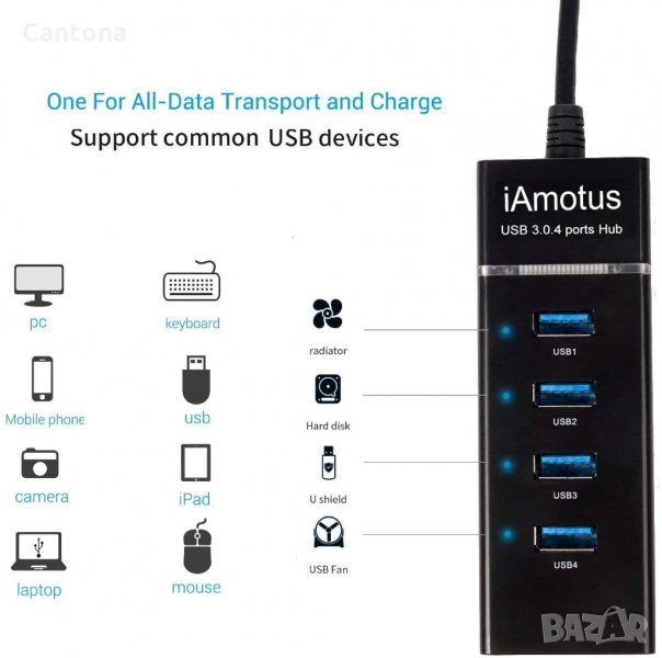 iAmotus USB хъб, 4 порта USB 3.0 Superspeed 5Gps, многопортов адаптер с LED светлина