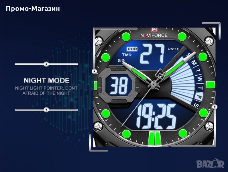 лагородна стомана с високоустойчива оксидация NAVIFORCE и стъкло от минерал-кристал устойчиво на надраскване. Водоустойчивост 3 АТМ.