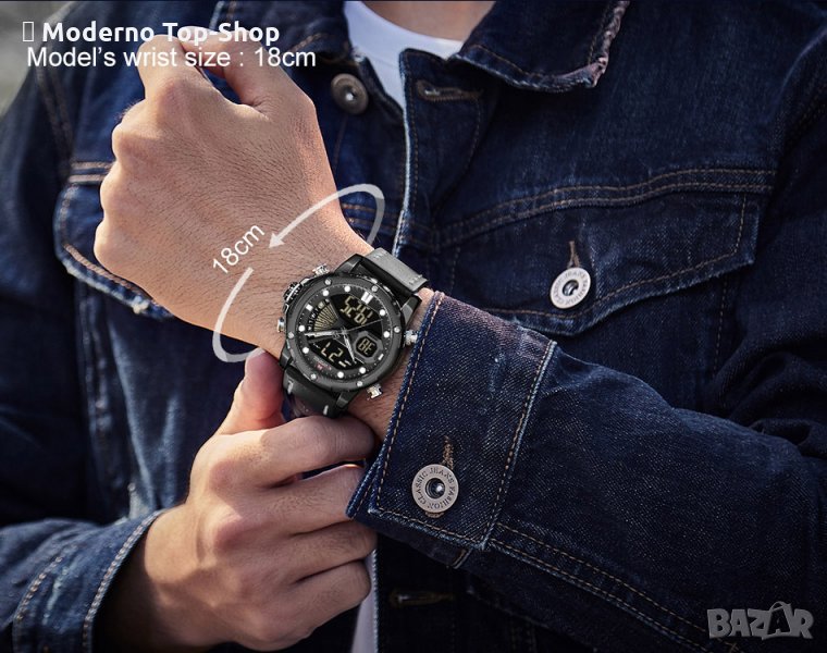 мъжки часовник с луксозна визия. Задвижва се от японски кварцов и електронен механизъм