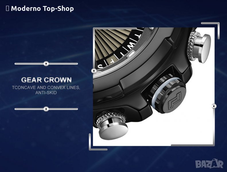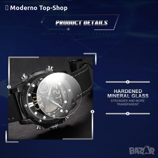 лагородна стомана с високоустойчива оксидация NAVIFORCE и стъкло от минерал-кристал устойчиво на надраскване. Водоустойчивост 3 АТМ.