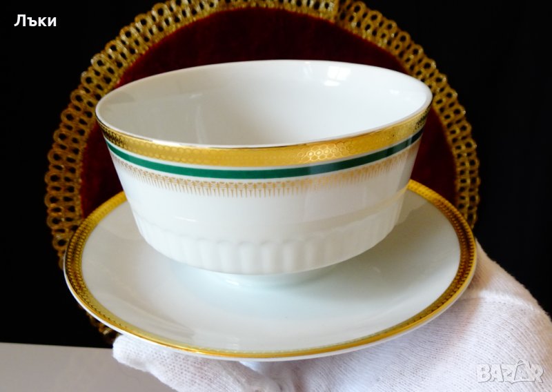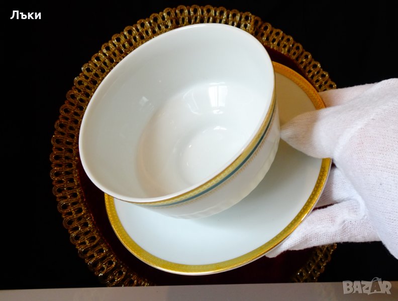порцелан,ръчно декорирана с релефен слитък 24 карата злато,маркирана.Височина 8 см.,диаметър на съда 12 см.,диаметър на основата 16 см.Вместимост 400 мл.