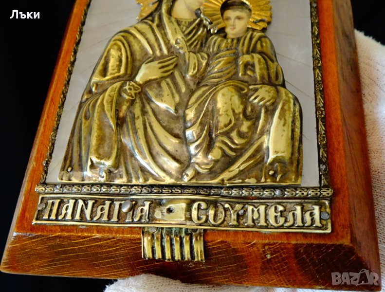 седеф на основа от естествено дърво в православния манастир Света Богородица Сумела.Манастирът е основан около 386 г. от двама атински монаси – Варнава и Софроний,които намират в една пещера чудотворната икона на Дева Мария Panagia
