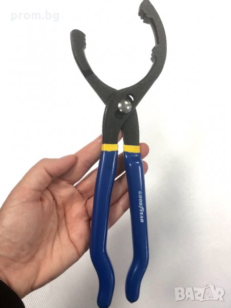 ключ, клещи за маслен филтър Goodyear, внос от Франция. Размери 2 x 11 x 37 cm; тегло 540 гр. Подходящ за монтаж и демонтаж на маслен филтър с диаметър от 6 см до 11,43 см.