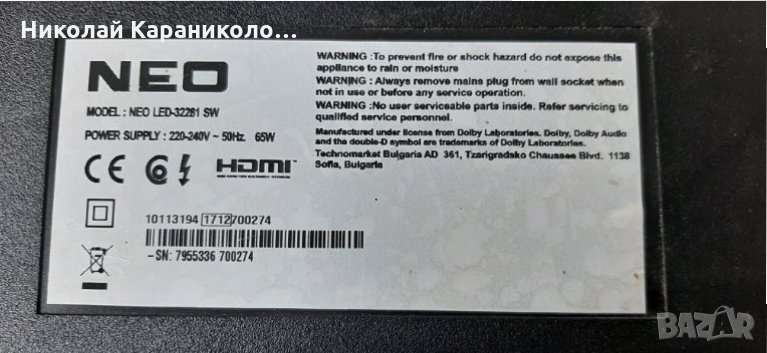 Продавам тв NEO LED-32281 SW за части по причина-счупена матрица/VES315WNDL-2D-N15/.Редовни съответно: