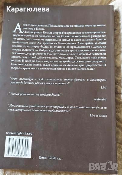 А Гаелия умира. Целият остров бива разкъсван от кръвопролития. Дори вълците не са пощадени от сеч. Огънят на омразата се разгаря все по-силно, подхранван от фанатизъм и жажда за власт, а магията бавно и необратимо чезне. Да, времето на Гаелия изтича. Алеа трябва да спаси силваните, да отърве бялата си спътница от преследващите я ловци, да открие същината на Мойрата, да разтълкува трите пророчества и - най-важното - да се приготви за бъдещето. Бъдеще, което може и да не настъпи никога. Защото той дебне в сенките. Маолморда. Този, който носи тъмен пламък. И Алеа ще бъде сама, когато ще трябва да се изправи срещу него.