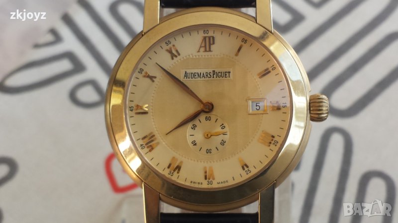 Нов мъжки часовник на легендарната швейцарска фирма Audemars Piguet с американски кварцов механизам ISA , позлатен корпус, кожена каишка с черен цвят, брандирана с логото на фирмата, позлатена закопчалка с логото на фирмата. Диаметър на касата 43 милиметра.