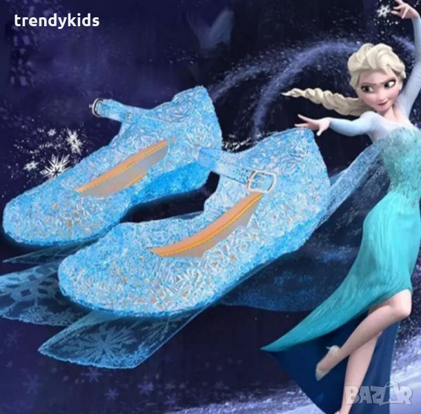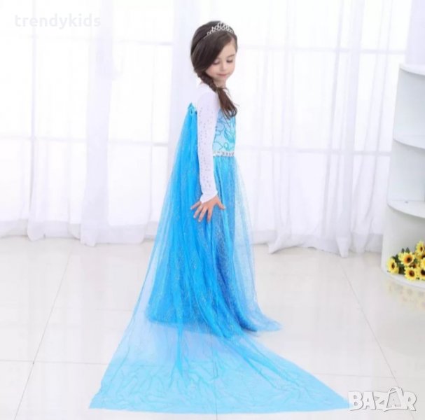 рокля Елза с дълъг шлейф- с орнаменти от бляскави камъчета, който елегантно се влачи по земята. Роклятя е с бели ръкави- бюстие от еластична, мека мрежеста материя.Бието и по ръкавите са украсени с прозрачни камъни. На гърдите има голяма ледена снежинка (от прозрачни камъчета). Полата е от два слоя- долният от син сатен, горният слой от синя- бляскаво заскрежена, мрежеста материя. Шлейфът може да се сваля!!!