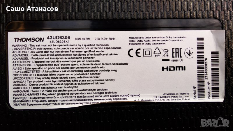 THOMSON 43UD6306X1 със счупена матрица (панел LVU430NDEL AD9W14 V2 )