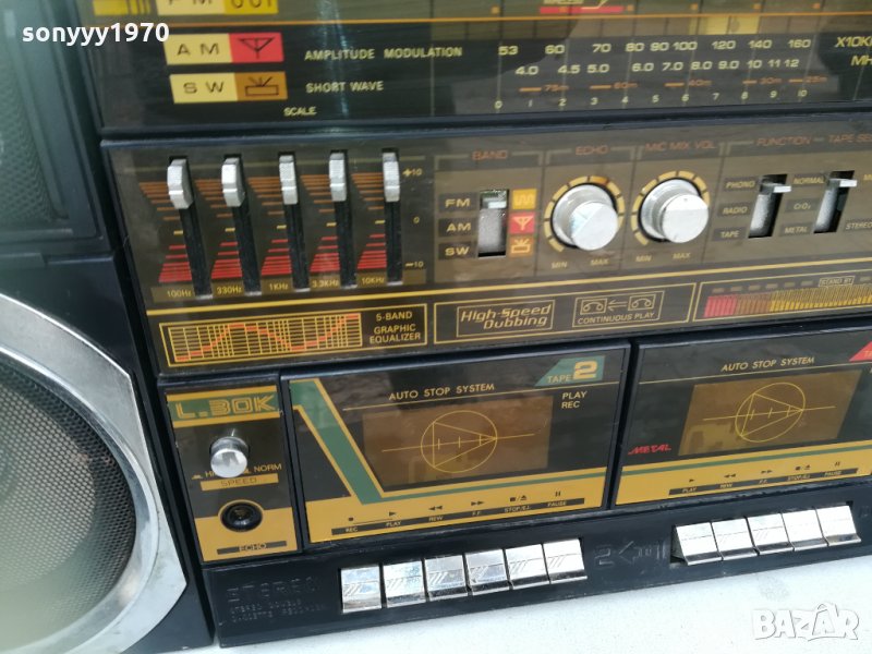 поръчки само тук в саита with disco light-голям двукъсетъчен-АНТИКА-РЕЛИКВА-КОЛЕКЦИОНЕРСКА голяма и яка машина от едно време-диско светлини в колоните-свирят и светят идеално-/тествани с друг усилвател/ касетите въртят индикаторите светят но звук от изходите няма-чува се леко пукане-превключватела за касета и радио не щрака хубаво-което ме навежда на мисълта че нещо не контактува-трябва да се отвори и пръсне с спреи...липсва антената-които разбира и може да си го оправи-пращаме със спиди или еконт с преглед и тест след превод на капаро за куриерската услуга поради зачестили некоректни потребители-поръчки само тук в саита! по телефона и със смс не! краини цени! бартери не правиме! ПАРИ НЕ ВРЪЩАМЕ! всеки ден нови неща-още 2-3 наши обяви тук