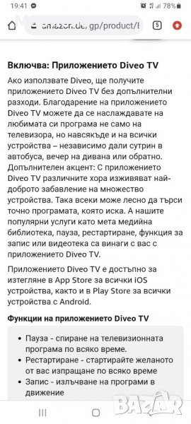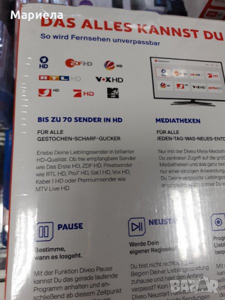 Мобилен: със сателитния HD приемник ще получите безплатно и приложението Diveo TV. Можете да инсталирате това приложение на смартфона или таблета за Android или iOS и след това да се насладите на пълната телевизионна програма навсякъде в движение