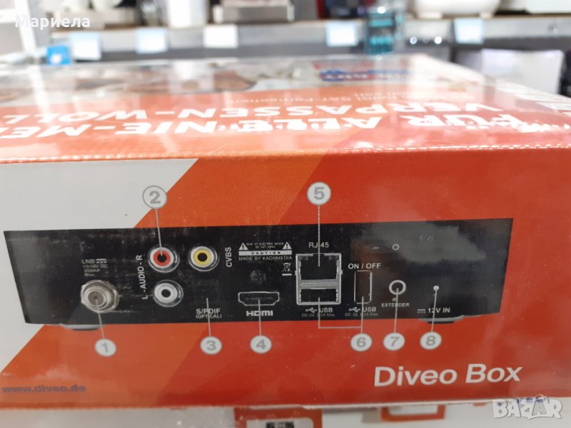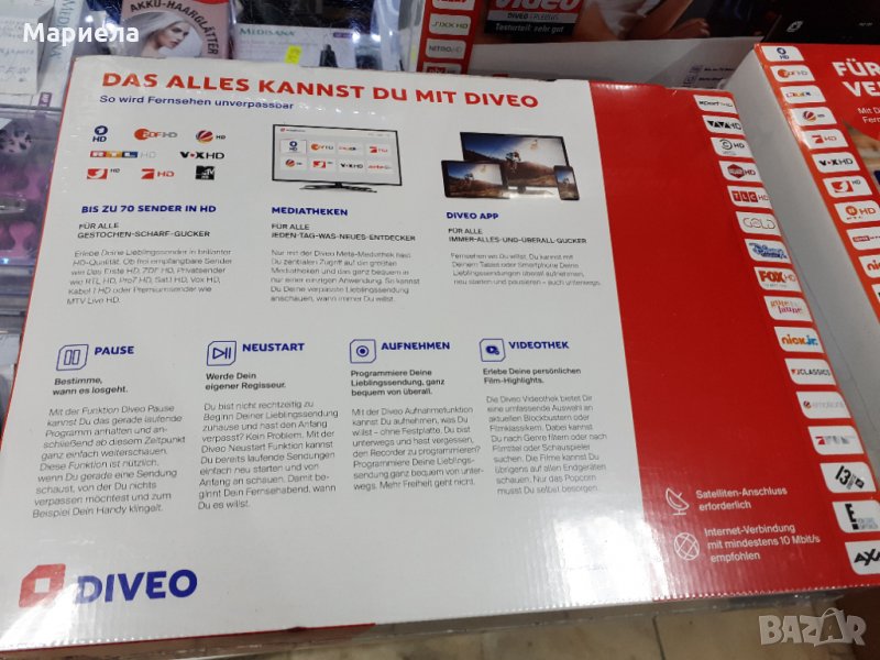 Предпоставка: Сателитният приемник Diveo HD разгръща в пълна степен своите възможности само с договор за изпълнение от Diveo, което включва допълнителни разходи. Най-малкият телевизионен пакет от Diveo струва £7,90 на месец. Ще получите този пакет безплатно за 3 месеца, когато го закупите. Без договора за изпълнение, можете да видите само свободно приеманите предаватели чрез сателит с този сателитен приемник
