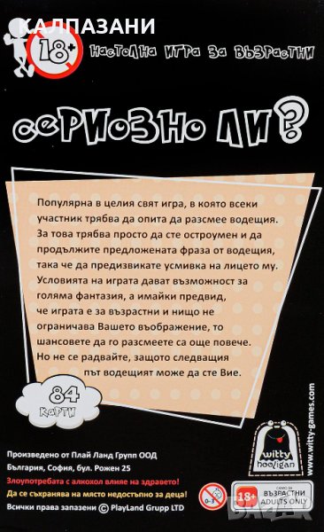 Сериозно ли? е игра за възрастни над 18 години от серията Witty Hooligan. В нея един от играчите е избран за водещ, а всички останали имат за цел да го накарат да се засмее. За да постигнат това, те теглят карти от тестето, на което са написани изречения. Те трябва да ги довършат свободно, но така, че да разсмеят водещия.