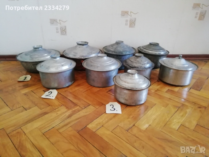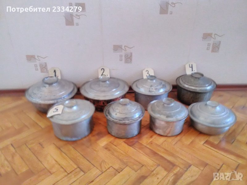 Автентични стари домакински съдове,медни-бакърени тенджери. Размерите на N:1 широчина 30см.,дълбочина 12см., вместимост 4литра,тежи 1.5кг.(наковано,,СЛАВА ДЖАМОВЪ 16октм. 1903годъ) цена 23€.; N:2 широчина 30см.,дълбока 12см.,обем 3.5литра,тежи 1.3кг.,цена 20€.(наковано,,Н.ДРАЖЕВЪ"); N:3 ширичина 24см.,дълбока 13см.,обем 3литра,тежи 1кг.(със надпис ,, под.Ст.Щеревъ") цена 20€.; N:4 широчина 24см.,дълбочина 13см., тежи 1кг.(надпис,,Д.Х.ГЕОРГИЕВЪ") цена 23€.; N:5 широчина 23см.,дълбока 12см.,тежи1кг.,цена 17€.; Със номера и ябълка / N:1 ширичина 20см.,дълбочина 12см.,тежи 700гр.,цена 13€.; N:2 широчина 20см.,дълбока 11см.,тежи 750гр.,цена 15€.; N:3 широчина 23см.,дълбока 8см.,тежи 600гр.,цена 15€.(надпис В.Г.К.)