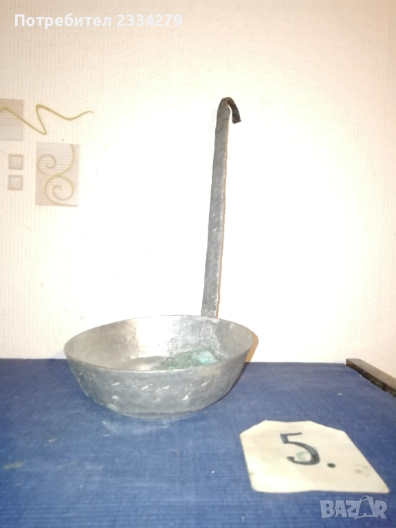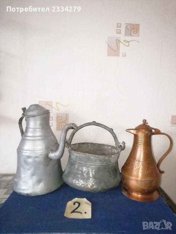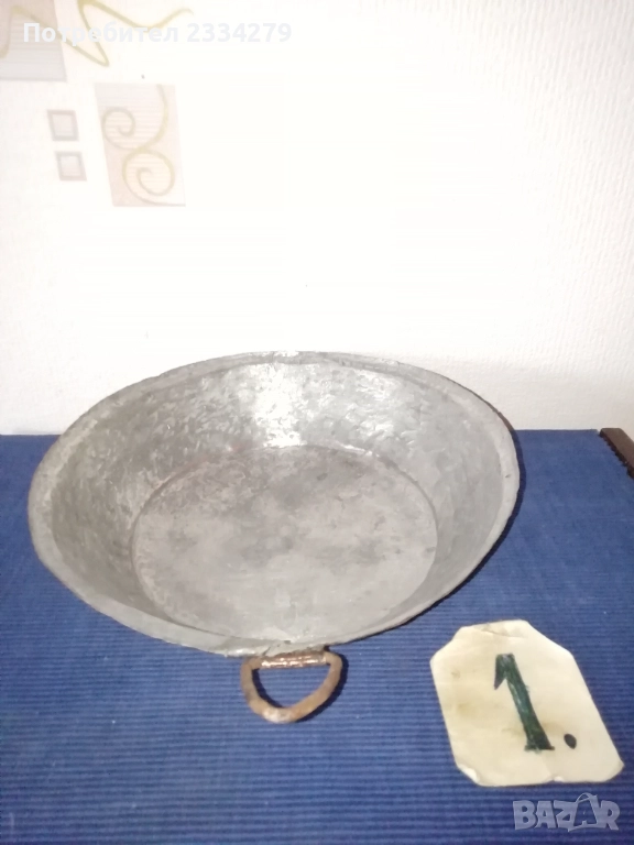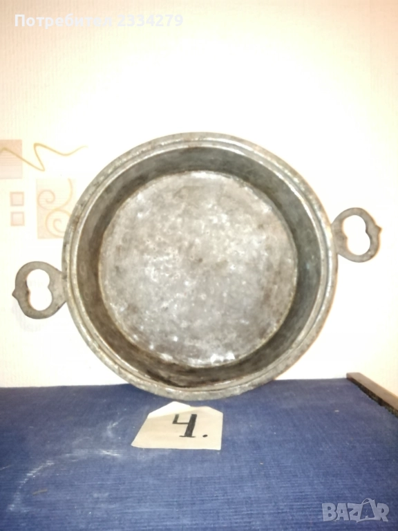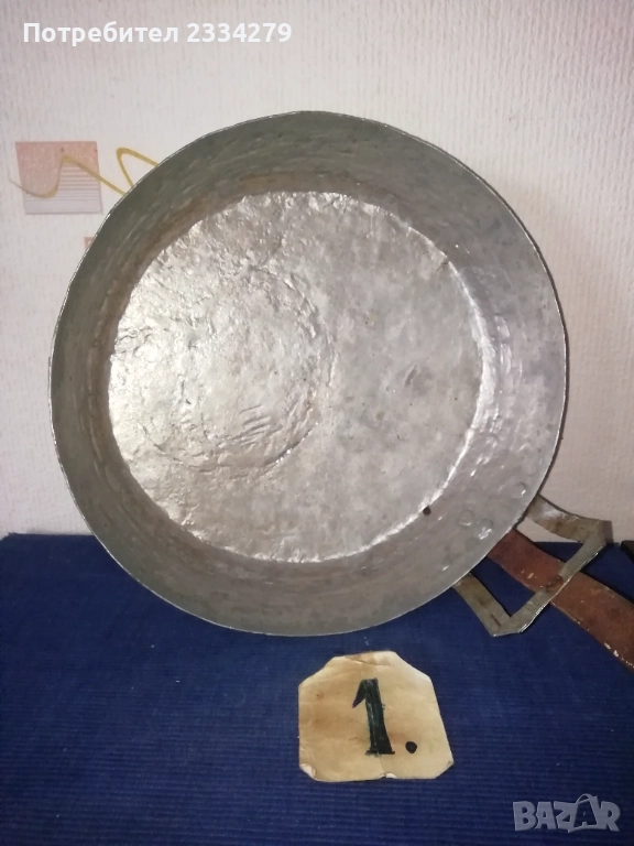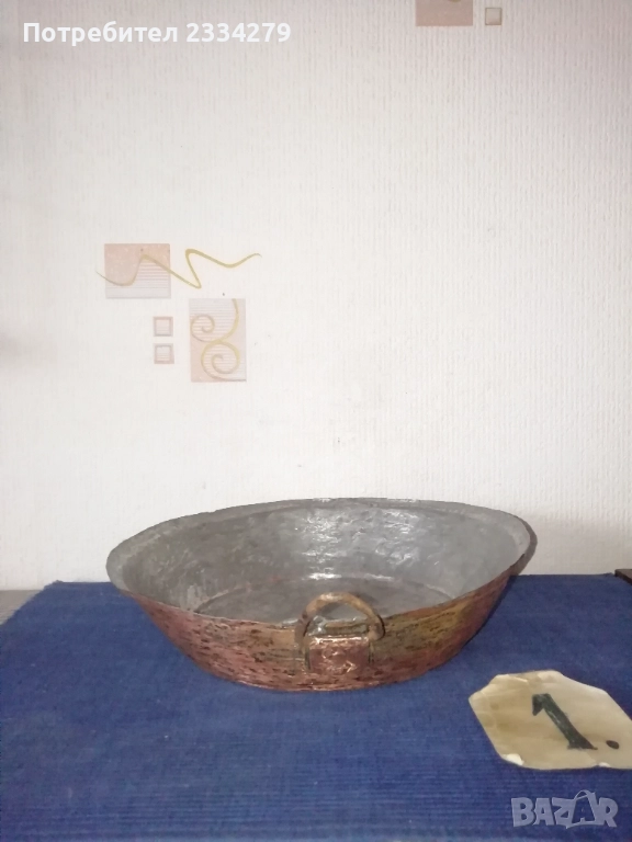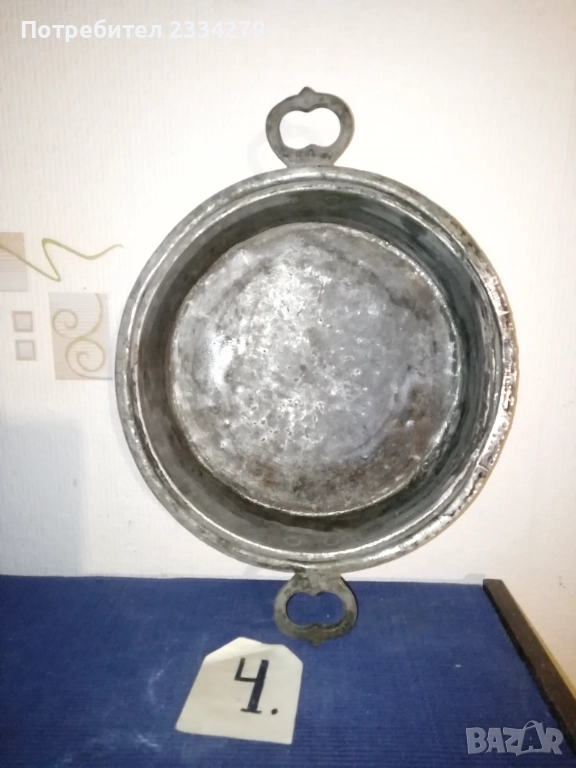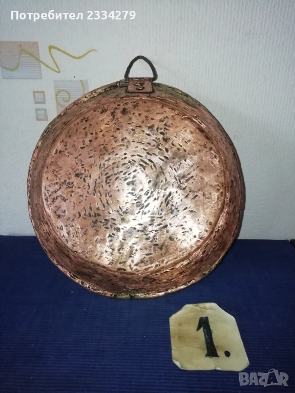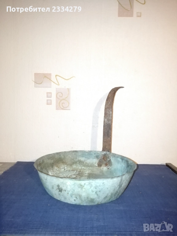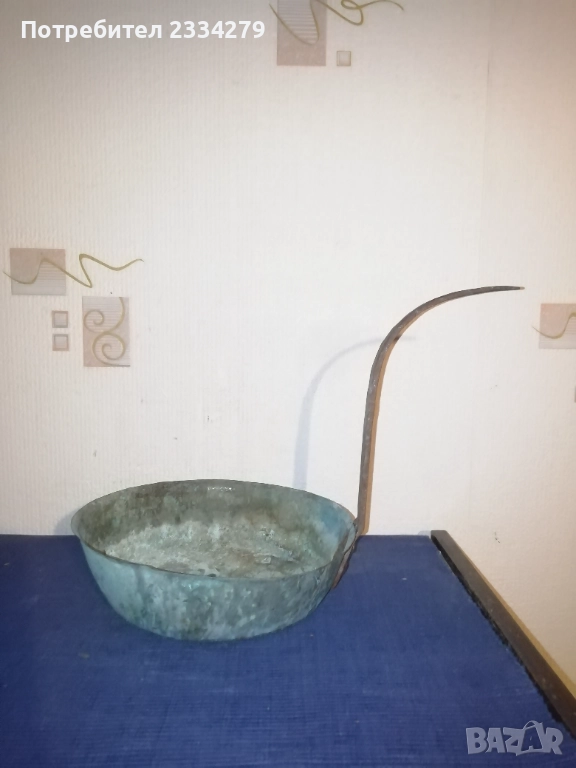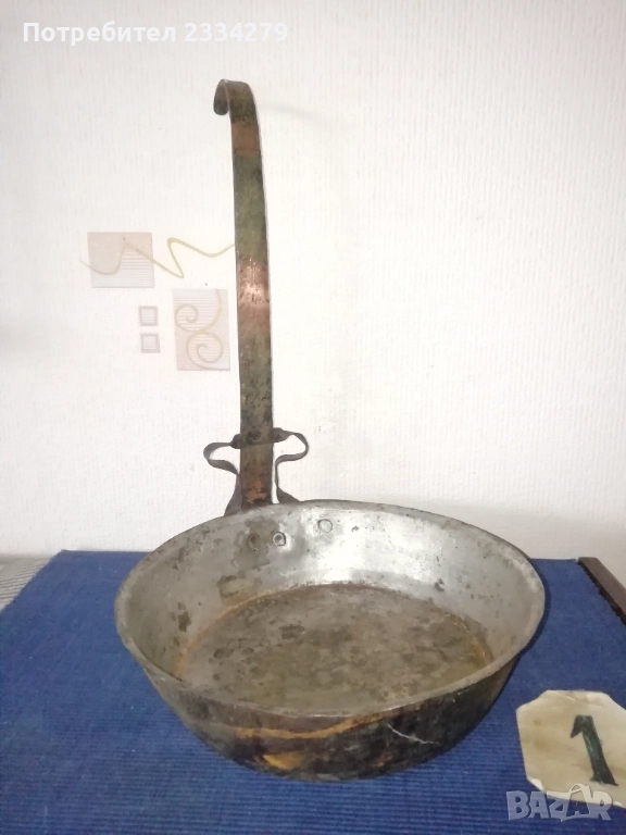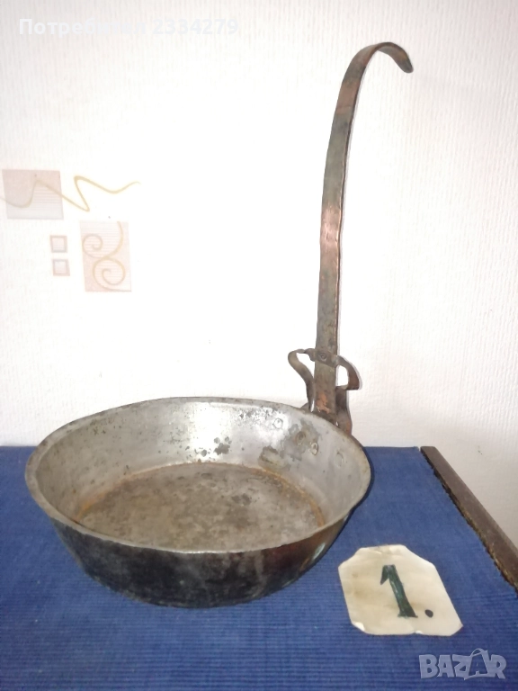 Стари бакърени тигани,ръчно изковани-калайдисани от различни майстори в различни времена. Декорация,колекция за битова стая кът механа. Тиган без номер N:1 ръчно изкован и калайдисани тиган с размери на тавата без дръжка широчина 22см., дълбочина 6см., не е почистване от патина, 100% автентичност, цена 30лв.; N:1 стар възрожденски ръчно изработен изкован изцяло от мед, има орнаментирана медна дръжка, размери: височина с дръжката 40см., широчина 26см.,дълбочина 7см., тежи 1кг.300гр., цена 50лв.; N:1 тиган с къса дръжка-кука и размери: широчина 27см.,дълбок 8см.,тежи 850гр.,цена 20лв.; N:4 стар тиган-тава, меден с бронзови дръжки 100% автентичност стара ръчно кована изработка с размери 35х7см., тежи 800гр., цена 37лв.; N:5 стар съд чарпак, пахар със дръжка ръчно изкован от възражденски майстор, меден калайдисан с наковани орнаменти по таса и дръжката размери 30х16см., цена 30лв.; N:6 бакърче, менче ръчно изработено-ковано от възрожденски майстор има инициали, иразмери: дъно 31см., гърло 17см., дълбочина 14см., целият е от мед и дръжката, тежи 910гр., цена 45лв.; N:7