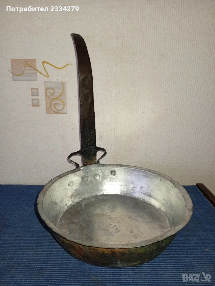Стари бакърени тигани,ръчно изковани-калайдисани от различни майстори в различни времена. Декорация,колекция за битова стая кът механа. N:0 тиган без номер ръчно изкован и калайдисани тиган с размери на тавата без дръжка широчина 22см., дълбочина 6см., не е почистване от патина, 100% автентичност, цена 20€.; N:1 стар възрожденски ръчно изработен изкован изцяло от мед, има орнаментирана медна дръжка, размери: височина с дръжката 40см., широчина 26см.,дълбочина 7см., тежи 1кг.300гр., цена 30€.; N: тиган с къса дръжка-кука и размери: широчина 27см.,дълбок 8см.,тежи 850гр.,цена 15€.; N:4 стар тиган-тава, меден с бронзови дръжки 100% автентичност стара ръчно кована изработка с размери 35х7см., тежи 800гр., цена 25€.; N:5 стар съд чарпак, пахар със дръжка ръчно изкован от възражденски майстор, меден калайдисан с наковани орнаменти по таса и дръжката размери 30х16см., цена 20€.; N:6 бакърче, менче ръчно изработено-ковано от възрожденски майстор има инициали, иразмери: дъно 31см., гърло 17см., дълбочина 14см., целият е от мед и дръжката, тежи 910гр., цена 30€.; N:7