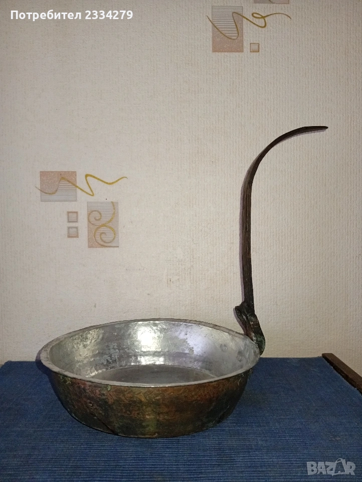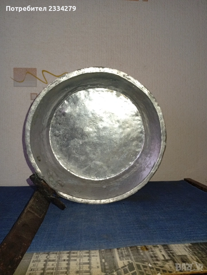 аломиниев стар ибрик за декорация на битова къща, механа, двор, градина, размери 30х17см., цена 10€. N: тиган меден ръчно изработен, калайдисан добре запазен с дръжка, около 100годишен, наковани орнаменти, цена 30€. Всичко е автентичност и подходящо за декорация на битова къща, стая, кът, механа-заведение.