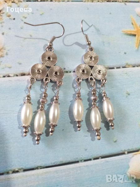 Нов модел перлени висящи обици в стил Арт Нуво с орнаментирана основа в цвят Сребро → Обява 34860779