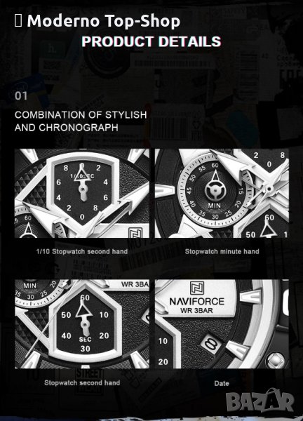 Страхотен модерен мъжки часовник с луксозна визия. Задвижва се от японски кварцов механизъм Seiko. Има корпус от благородна стомана с високоустойчива оксидация NAVIFORCE и стъкло от минерал-кристал устойчиво на надраскване. Водоустойчивост 3 АТМ.