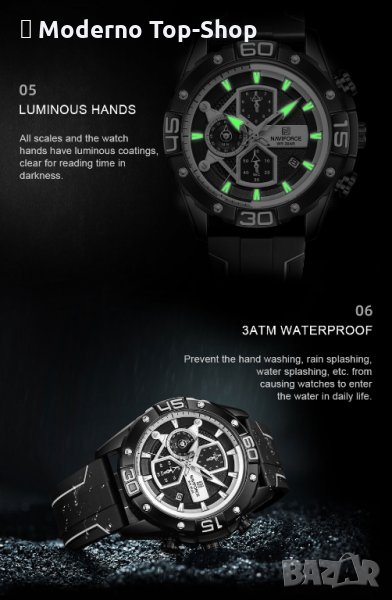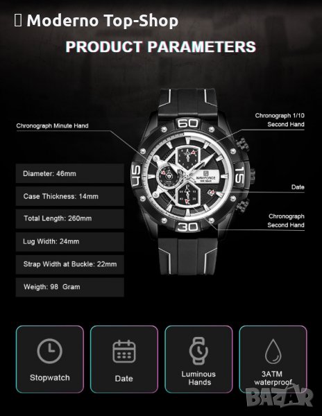 Часовник NAVIFORCE NF 8018T BBW се предлага в луксозна брандирана кутия, гаранция,бърза доставка в рамките на 1-2 работни дни.