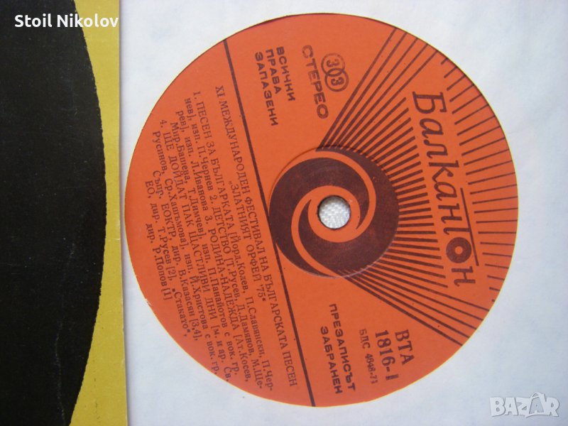 Грамофонна плоча - ВТА 1816 - Златният Орфей '75: XI международен фестивал на българската песен