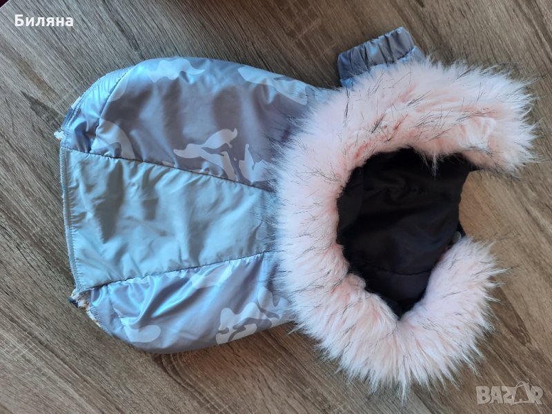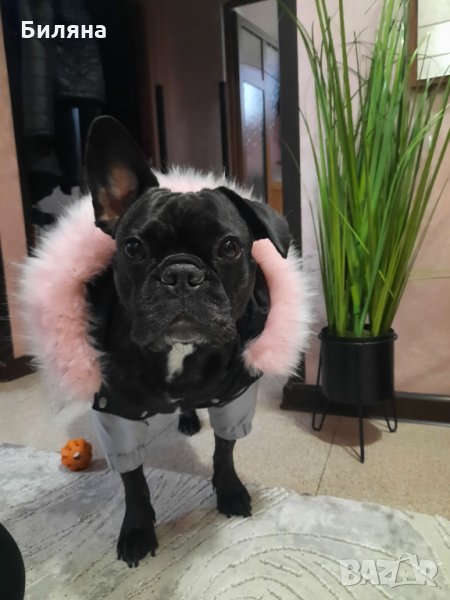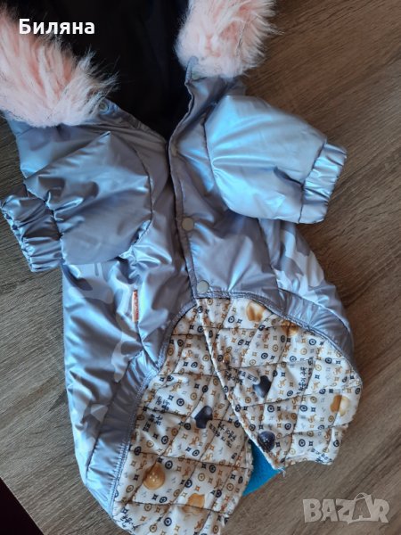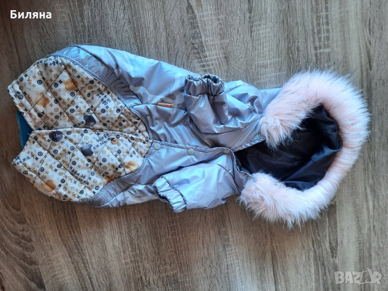 Прекрасно зимно якенце от водо и ветроотблъскваща материя. С тик-так копчета. Дължина на гръбчето 38 см., ширина под мишниците 25 см. На снимките е моето куче, на което на ширина му е малко и не мога да го закопчая и затова го продавам или разменям за по-голямо. Кучето ми е 14 кг.