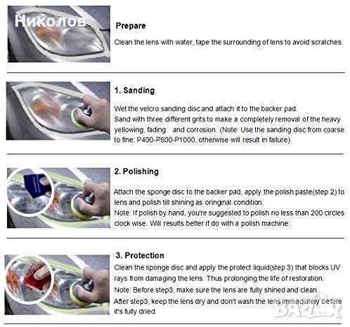 ВАЖНО: Полирането и почистването на фаровете да не е на пряка слънчева светлина.