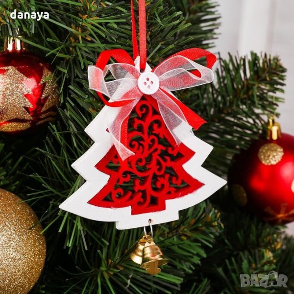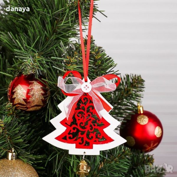 Дървена играчка за коледната елха с форма на елхичка и звънки звънчета. Допълнително е декорирана с червени и бели панделки и копче за разкош. Бялата част е изработена от МДФ материал, а вътрешната червена част е направена от филц. Висулката може да се закачи и върхи по-голям предмет или на стена. Чудесна коледна украса!