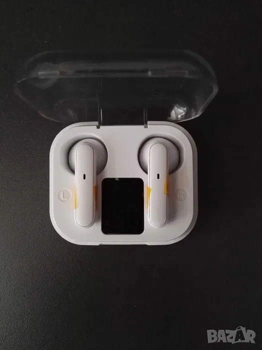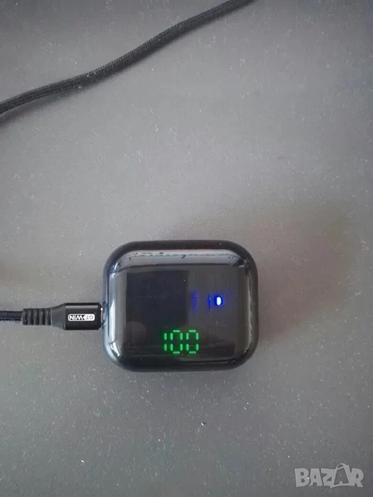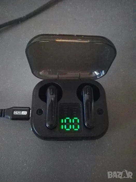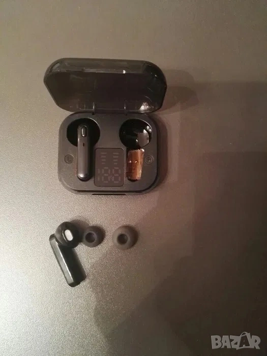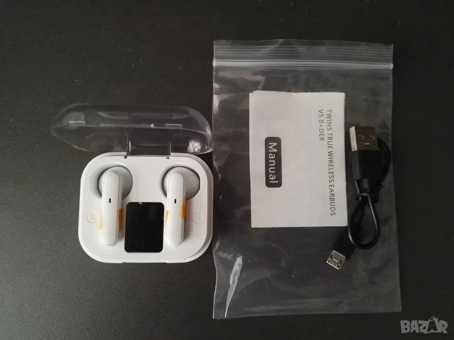 Комплектът съдържа зарядна станция, два броя блутут слушалки, кабел за зареждане на станцията, 2бр. силиконови тапички, инструкции за употреба.