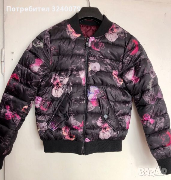 Пухено Яке с две лица. От едната страна е черно на цветя, от другата бордо. Размер: 146/152 . С ластик на ръкави и основна част. Никога не е обличано, защото ни беше подарък и беше малко. Само изпрано.