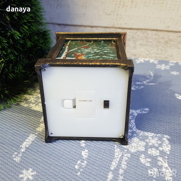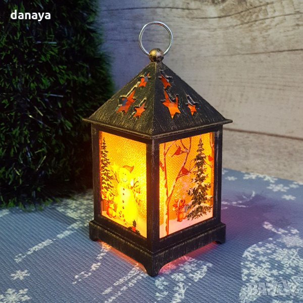 Малък ретро коледен фенер с приказен снежен принт от четирите си страни. Може да се закачи и да се превърне в приказна висяща коледна украса. Вътре във фенерът има лед свещичка, която свети в много мека жълта светлина и мига, имитирайки истинска горяща свещ. Работи с LR44 батерии, които са включени в комплекта. Фенерът се предлага в кутия, подходящи за коледен подарък.
