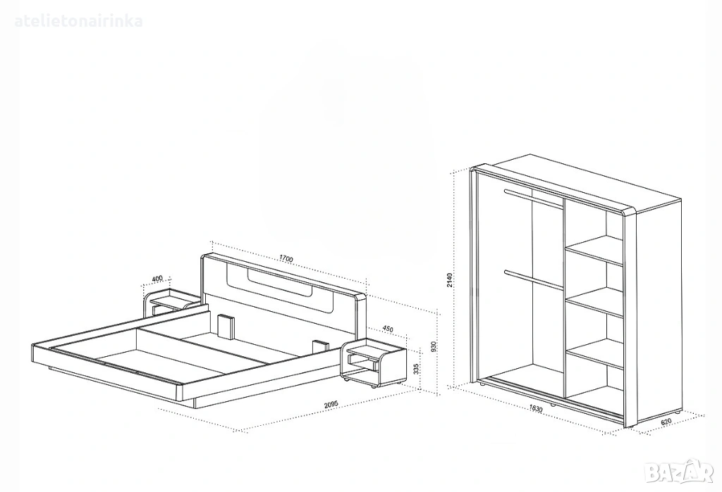 Спалня с 2 бр. нощни шкафчета: 259/ 209,5/ Н93 см;