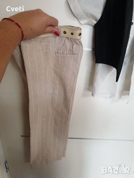 Бяла ленена риза с бежов панталон комплект , памук и лен . Подарък елек в черно и бежов колан