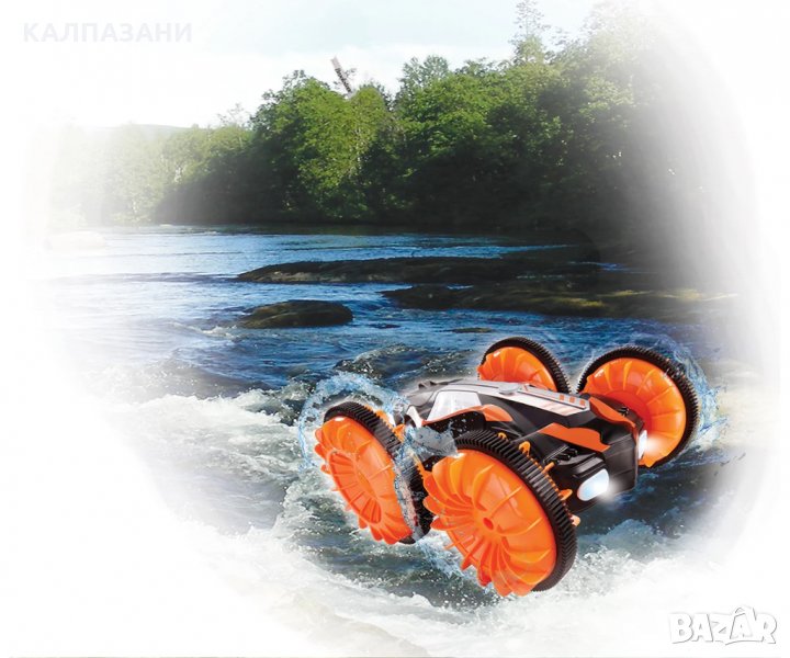 Това ярко оранжево радиоуправляемо превозно средство от Dickie Toys е истински универсален автомобил, предназначен за преодоляване на широк спектър от препятствия. Каскадьорът с дистанционно управление може да се движи по суша и във вода със скорост до 10 км/ч. Проектиран за деца на възраст над 6 години, той също така разполага с функция за преобръщане, която работи и върху препятствия и на равни повърхности. Точно като истинска амфибия, RC Amphibious Flippy може да кара през спокойни езера, реки и езера. Разполага и с ярки светлинни ефекти за да е още по-забавно.