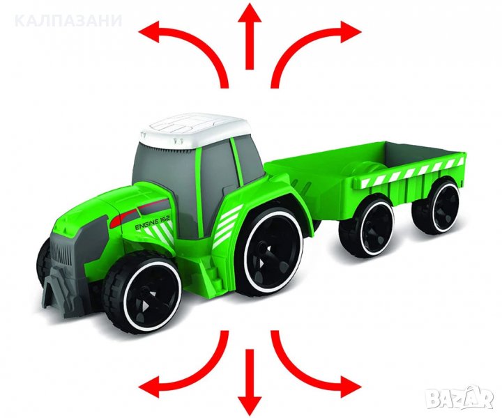 Трактор с дистанционно управление с ремарке. Със звукови ефекти и подвижно ремарке. До 5 м. 90 минути за използване.