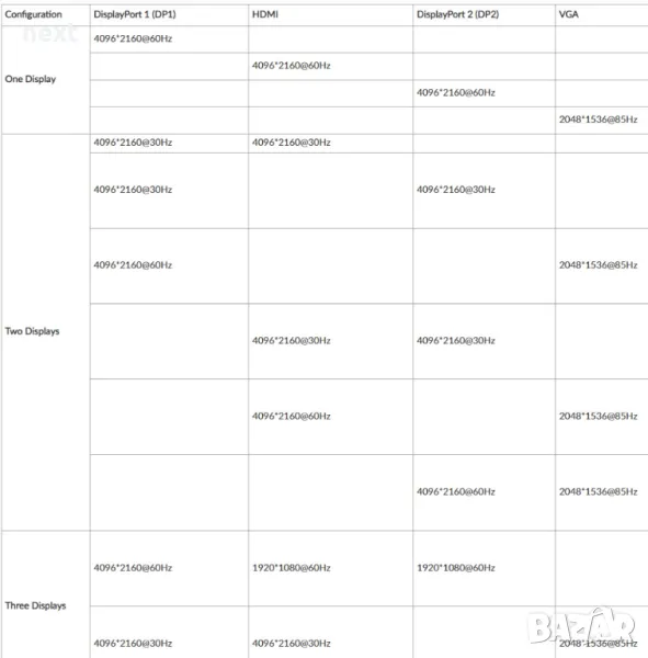 На последната снимка е показано при свързване на повече от един монитор какви резолюции се поддържат.