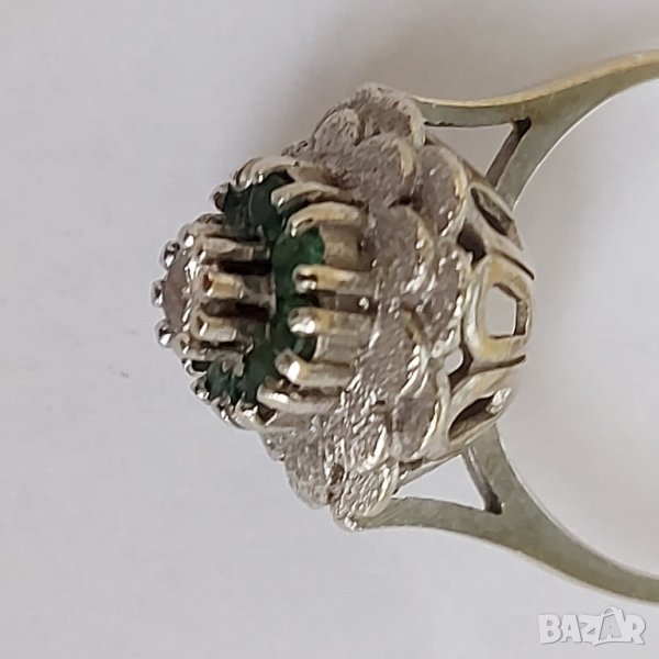 Златен пръстен, бяло злато с брилянт и естествени изумруди. 4,45 гр. 14 кр. С три печата за автентичност. Пръстенът е марков.