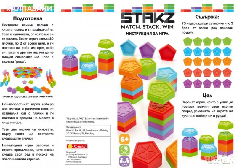 STAKZ! Подреждането на плочки - стратегическа игра за цялото семейство! 5 символа. 5 цвята. 10 стартови плочки всяка. Редувайте се в игра на плочки, като съвпадате по символ или по цвят. Тактически подреждайте и разделяйте кули от плочки, за да увеличите шансовете си за победа. Бъдете първият, който поставя всичките си плочки и спечелете!