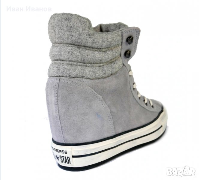 Converse от кожа в комбинация с плат – с прибл. 11 см танкетка; Отгоре Мека подплата, заобикаляща, широк гумен ръб с лек проблемен завършек; лепенка с лого на вътрешната подплата и гумена подметка с нисък профил