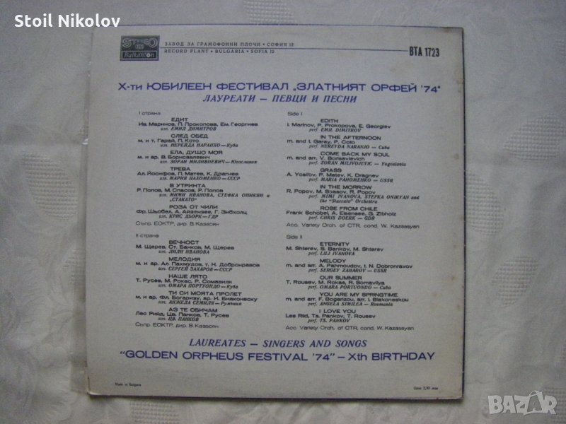 Грамофонна плоча - ВТА 1723 - Златният Орфей '74. Х-ти юбилеен фестивал: лауреати - певци и песни