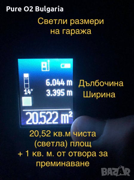✔️ Размери (светли): дължина 6,04 м. / ширина 3,39 м. / височина 3,23 м. при чиста площ (използваема): 20,52 кв.м. Входът на гаражът е със ширина 2,17 м.