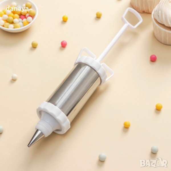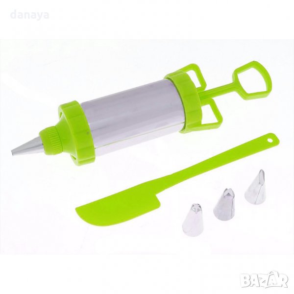 Сладкарски комплект, който се състои от шприц с метално тяло, 4 броя накрайници и сладкарска шпатула. Чудесен сладкарски комплект за декориране на торти и сладкиши.