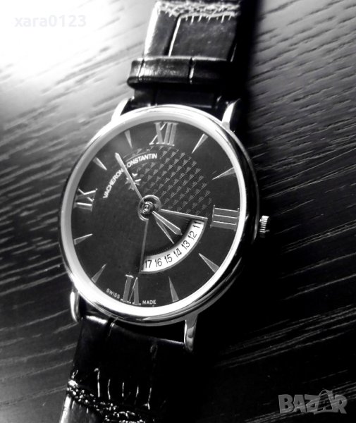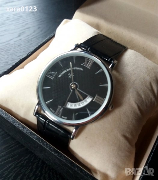 Луксозен ръчен часовник реплика Vacheron Constantin Classic, японски кварц, полиран корпус, изключително тънък(8 мм.), ефектен циферблат с дата, сребристи римски цифри, маркери и кожена каишка. . Диаметър 38мм.