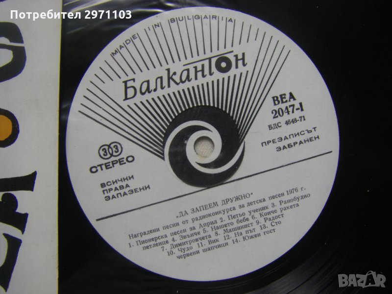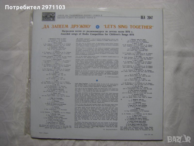 Грамофонна плоча - ВЕА 2047 - Да запеем дружно: наградени песни от Радиоконкурса за детска песен 1976 г.