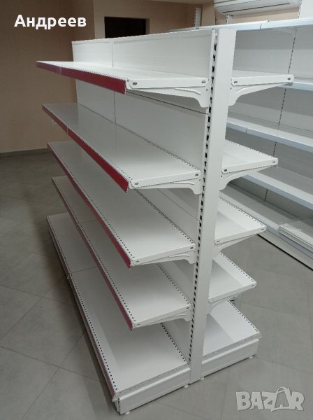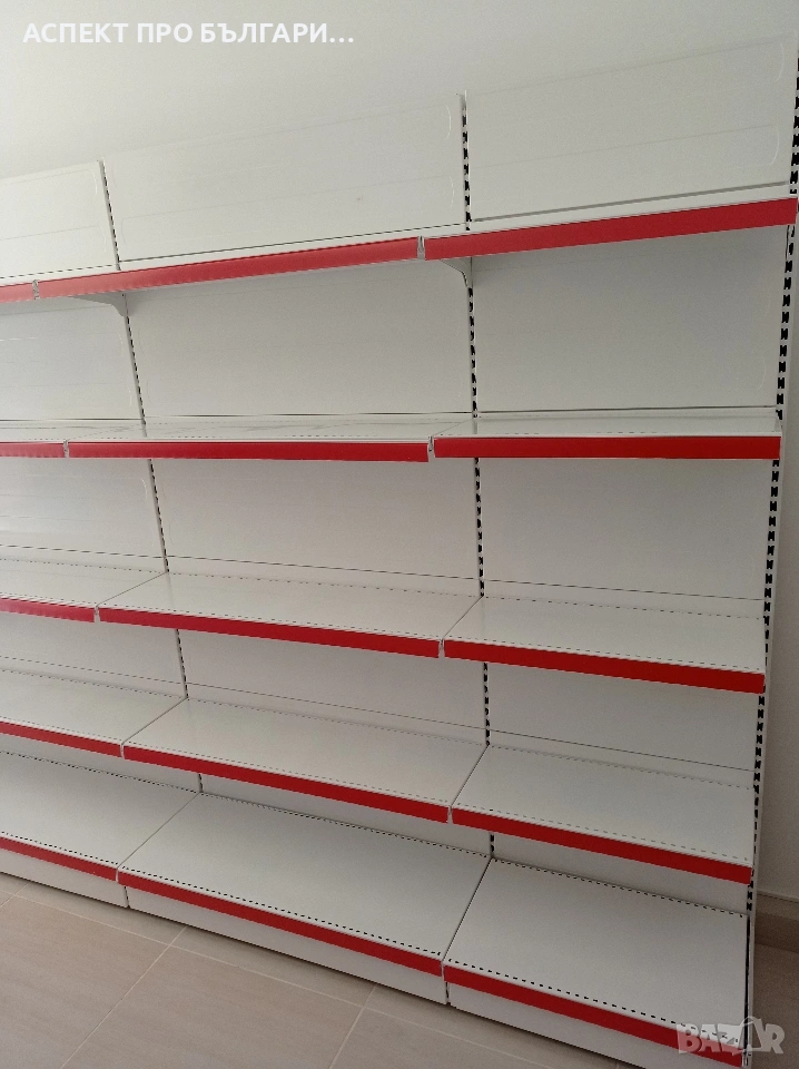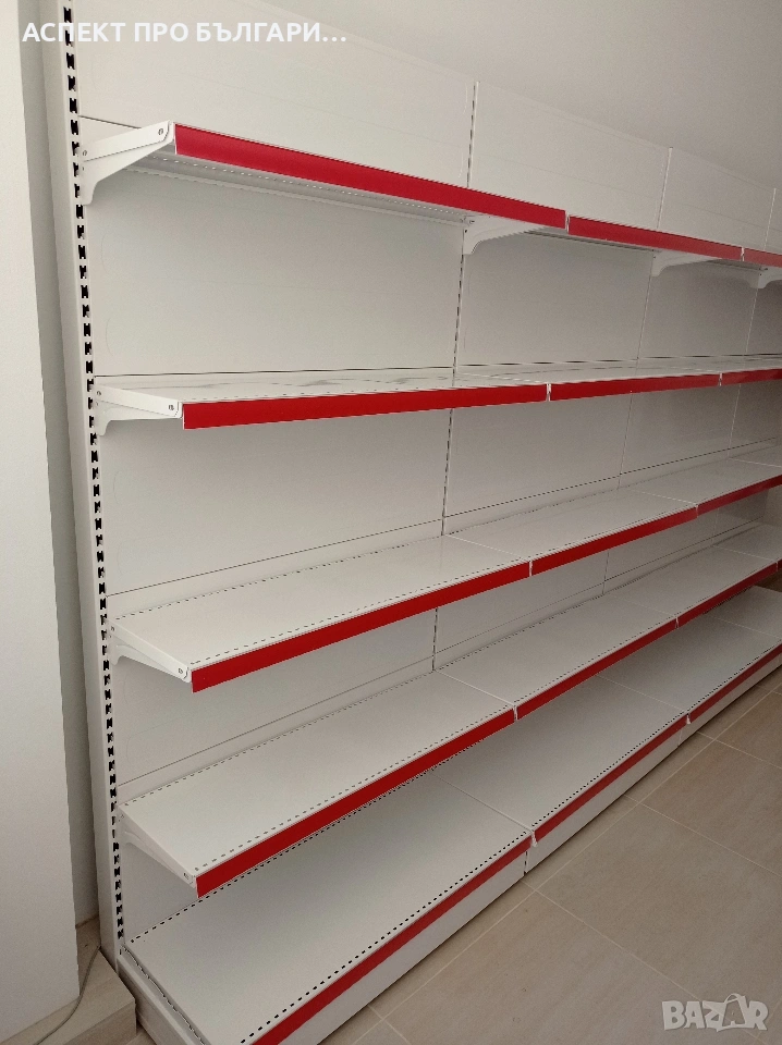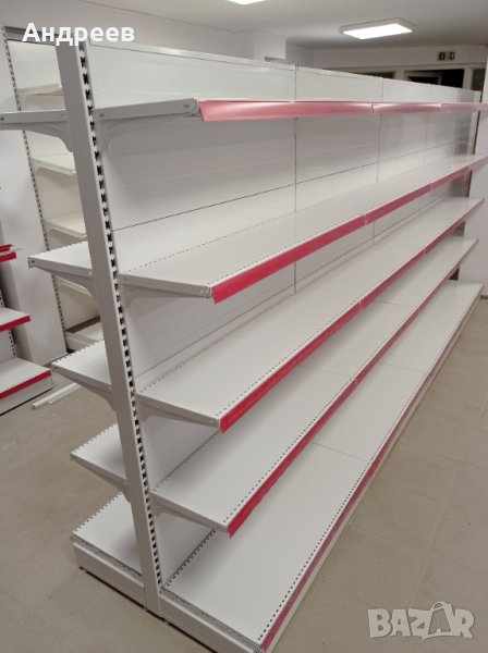 Метални крайстенни стелажи с основен рафт 100см х 40см и четири рафта 100см х 30см, плътни гърбове, ценови ленти, колона с пета и декоративно чело - долно.