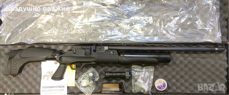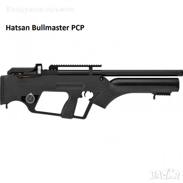 9. HATSAN Bullmaster (Turkbull) , калибър 5.5мм и 6.35мм , в комплект с reddot Optima 1x40 , зарядна станция Хатсан , ремък за носене, 2 броя пълнителя (барабани) , ключалка за спусък, О-пръстени , щуцер за зареждане.